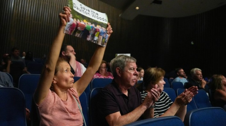 Tatiana Craig (left), a resident of McFarland Farms, holds up a sign June 9, 2025, during a full meeting of the City-County Council, at the City-County Building in Indianapolis.