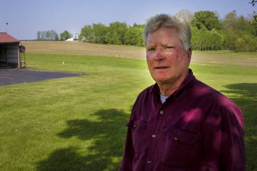Don Thomspon stands in front of farmland he’s owned since 1976. Thompson grew up in Argos and dreamed of owning his own farm one day. He says higher taxes would drive business from the area. Photo: Peter Balonon-Rosen/Indiana Public Broadcasting