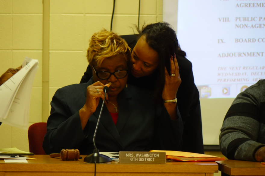 Gary Superintendent Cheryl Pruitt whispers to school board President Rosie Washington during a meeting of school trustees on Nov. 28, 2017. Both have since resigned. (Eric Weddle/WFYI Public Media)