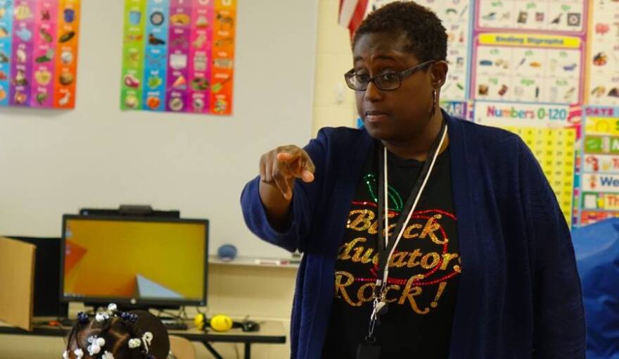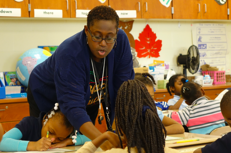 First-grade teacher Joy Cheatham asks a student to respond to a question during a reading class at Daniel Hale Williams Elementary School in on Nov. 28, 2017. (Eric Weddle/WFYI Public Media)