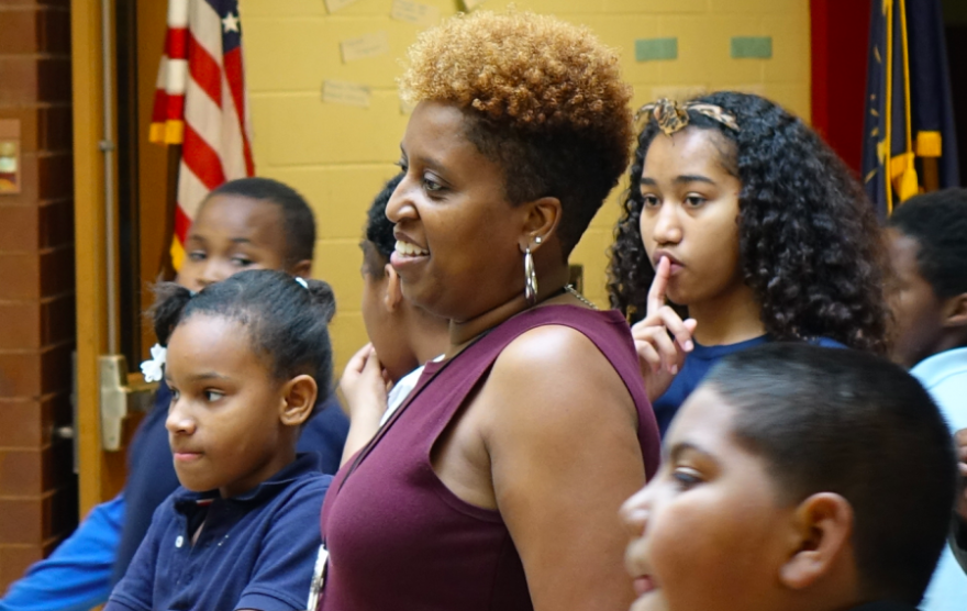 Sharmayne McKinley, the principal at Daniel Hale Williams Elementary Schools in Gary, walks with students on Nov. 28, 2017. McKinly believes the state takeover of the school district will lead to positive results because of the leadership of the emergency manager Peggy Hinckley. (Eric Weddle/WFYI Public Media)