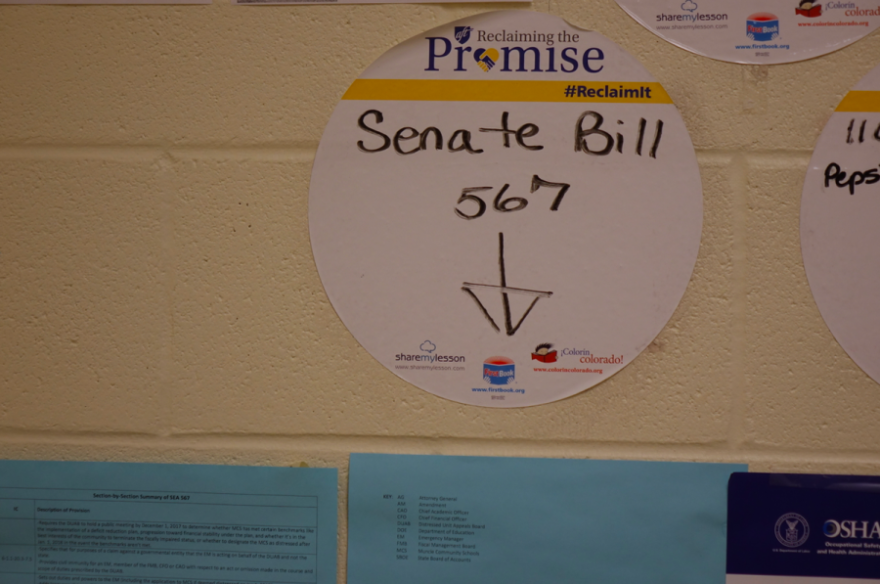 A sign with the Indiana State Law about the takeover of Gary schools hangs in the teacher's lounge at Daniel Hale Williams Elementary School. (Eric Weddle/WFYI Public Media)