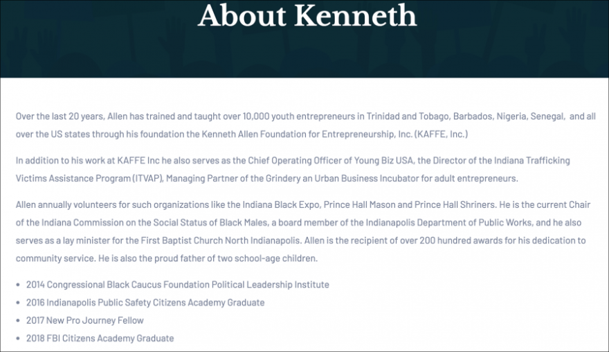 In August, the 37-year-old Allen launched his campaign with an announcement that said: “For the last 20 years, Kenneth has continued to train young entrepreneurs throughout the United States and across the world through the Kenneth Allen Foundation for Entrepreneurship.”