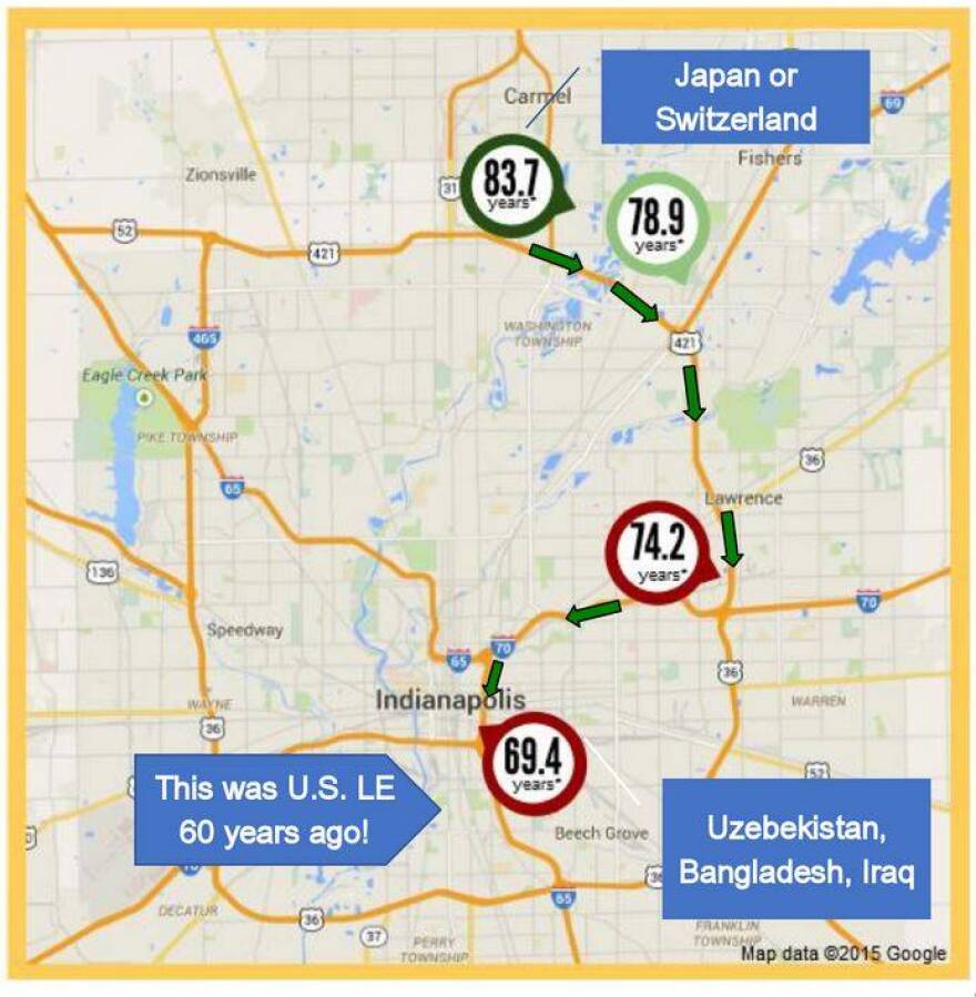 INDIANAPOLIS -- Up in Carmel the average life expectancy is nearly 84 years. But 13 miles south, in the middle of Indianapolis, it’s just over 69 years.