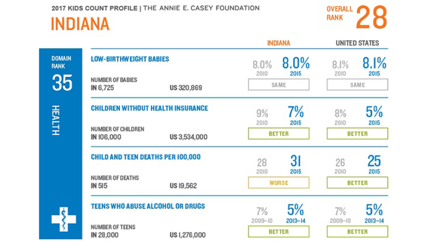 The 2017 Kids Count Data Book looks at children’s well-being in four areas: family, economics, education and health. In the health category, Indiana fell to 35th in the nation, down four spots.