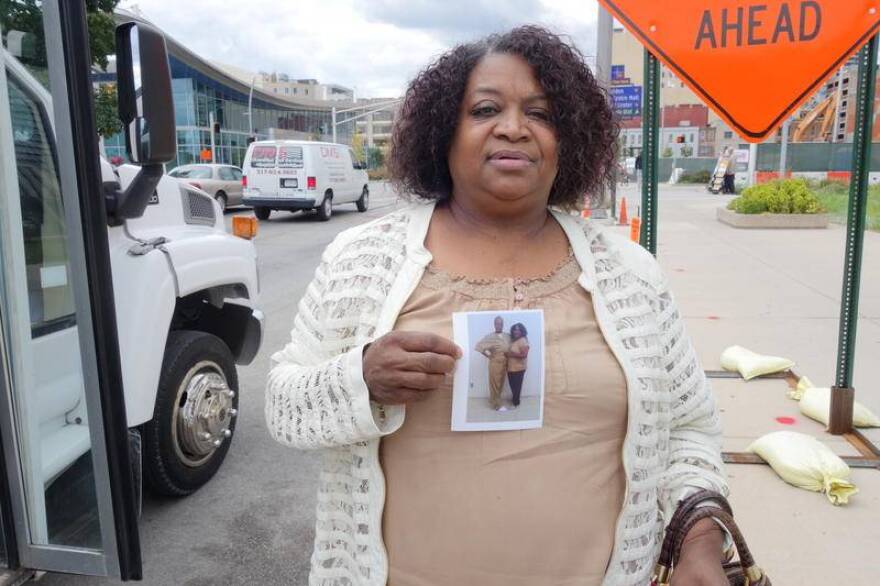 Janice McClain poses beside the Use What You've Got Prison Ministry bus, which connects people with their incarcerated family members. Photo: Emily Forman/Side Effects Public Media