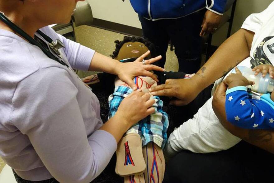 Meier teaches new parents how to locate their baby's spleen in an education session about what to expect with sickle cell disease. (Emily Forman/Side Effects Public Media)