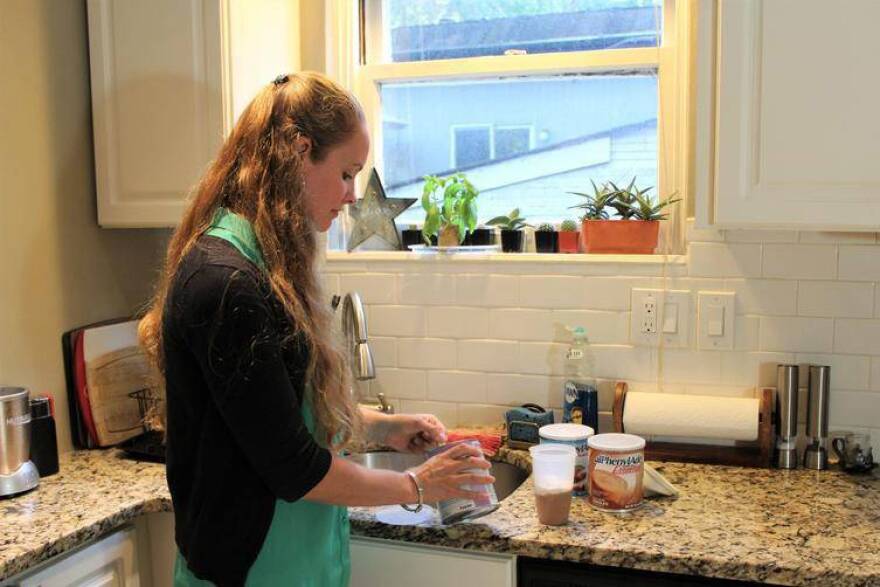 Amanda Moller prepares her formula in her home in University City, Missouri. The formula is vital to treat a rare condition, but her insurer doesn't cover it. (Sarah Fentem/St. Louis Public Radio)