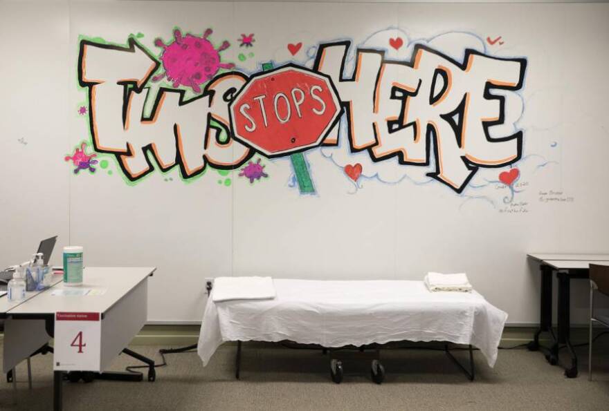 The vaccination clinic is in a room on the first floor of the IU  Neuroscience Center.  A half- dozen card tables have been converted into stations staffed by nurses and doctors who wait to administer vaccines. One wall is really a giant white board — a message reads “this stops here.”