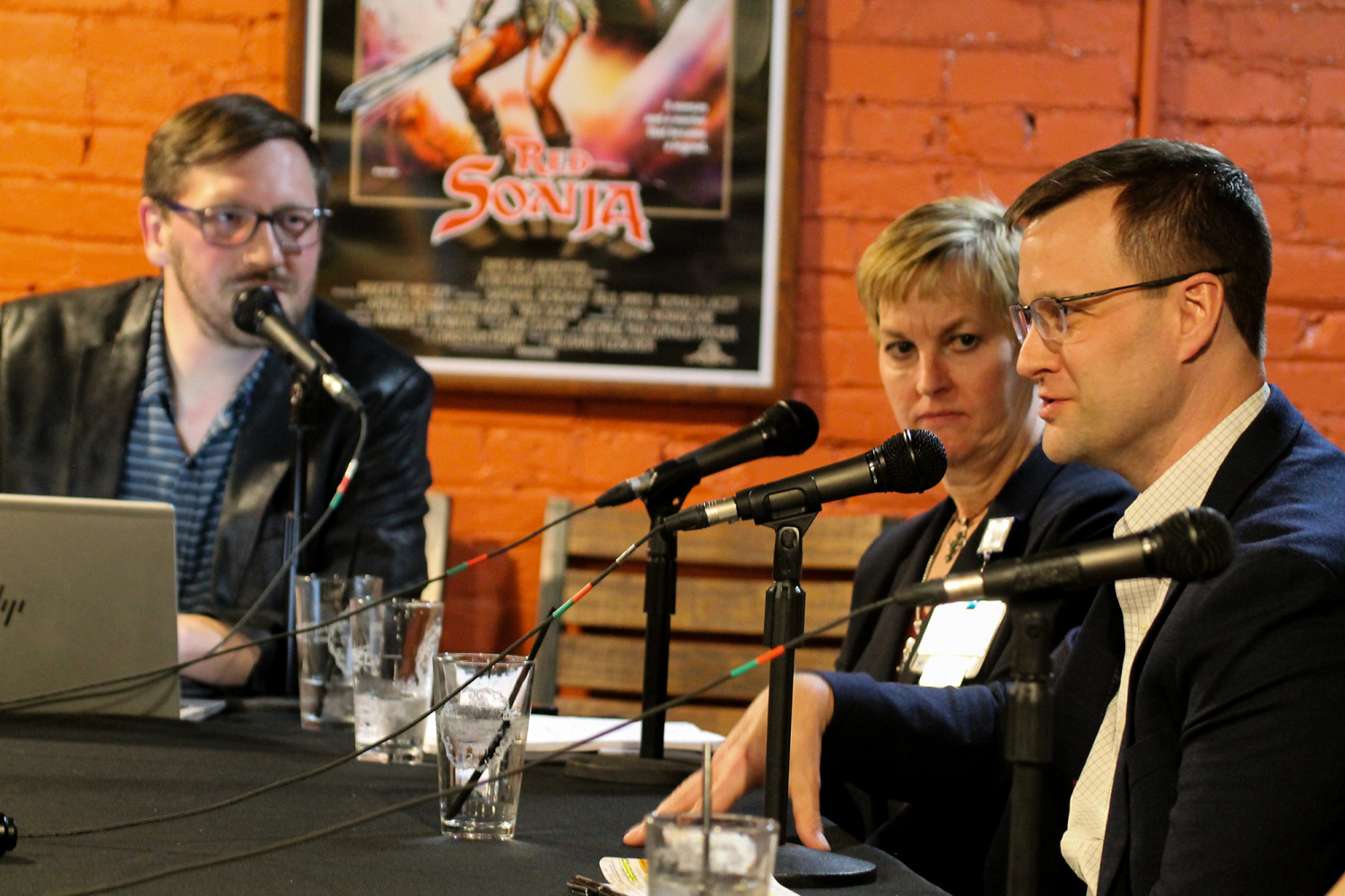 Covering Kids and Families policy director Mark Fairchild, right, answers a text question on how to predict the cost of a single-payer health care system at Damsel Brew Pub in Evansville during an Issues & Ales conversation.
