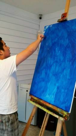 John mixes all his own paint colors, provided only the primary hues of red, blue and yellow. Yip says he has a gift for the dramatic use of complimentary colors – and that he innately tends to use more reds when he’s angry and blues when he’s serene.