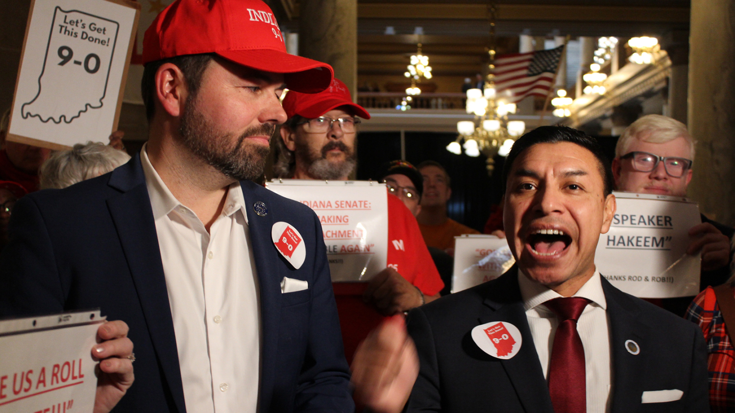 Lt. Governor Micah Beckwith (left) and Secretary of State Diego Morales (right) joined a group of people at the Indiana Statehouse on Tuesday, Nov. 18 in a rally to support new congressional maps that favor Republicans.
