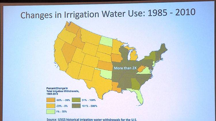 A slide illustrates the changes in irrigation water use from 1985 to 2010. (Rebecca Thiele/IPB News)