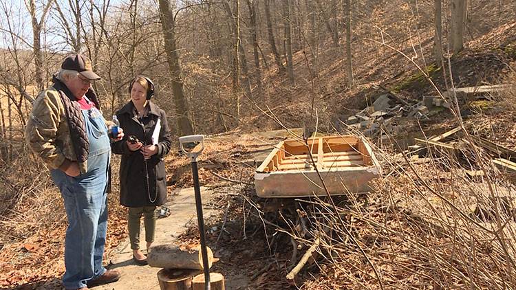 Brown County resident Mark Stines and reporter Rebecca Thiele stand on the footprint of Stines' old house. The soil underneath the house washed away in a 2001 flood and the house nearly fell off a cliff. (Tyler Lake/WTIU)
