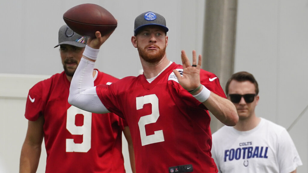 Indianapolis Colts quarterback Carson Wentz (2 ) throws as the team practiced at the NFL football team's facility, Thursday, May 27, 2021, in Indianapolis.