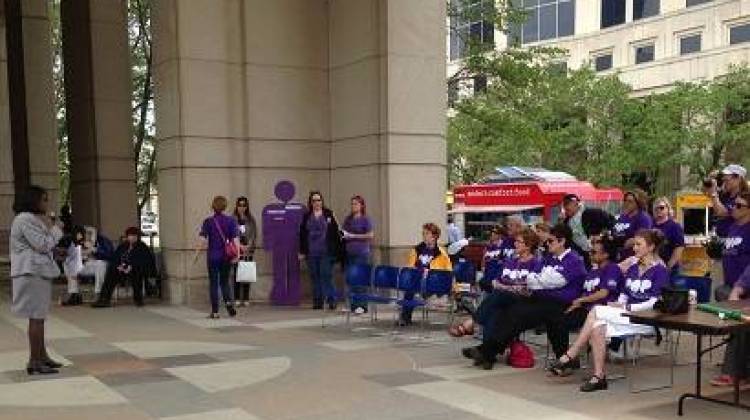 The crowd of mostly women sported purple shirts as a sign of solidarity against the disease that impacts nearly 36,000 Hoosiers.