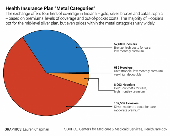 The federal exchange offers four different levels of coverage—Bronze, Silver, Gold and Catastrophic, categorized by premium prices, amounts of coverage and out-of-pocket costs. About 60 percent of the 169,000 Hoosiers who buy on the exchange opt for a silver plan, according to the latest federal data available.