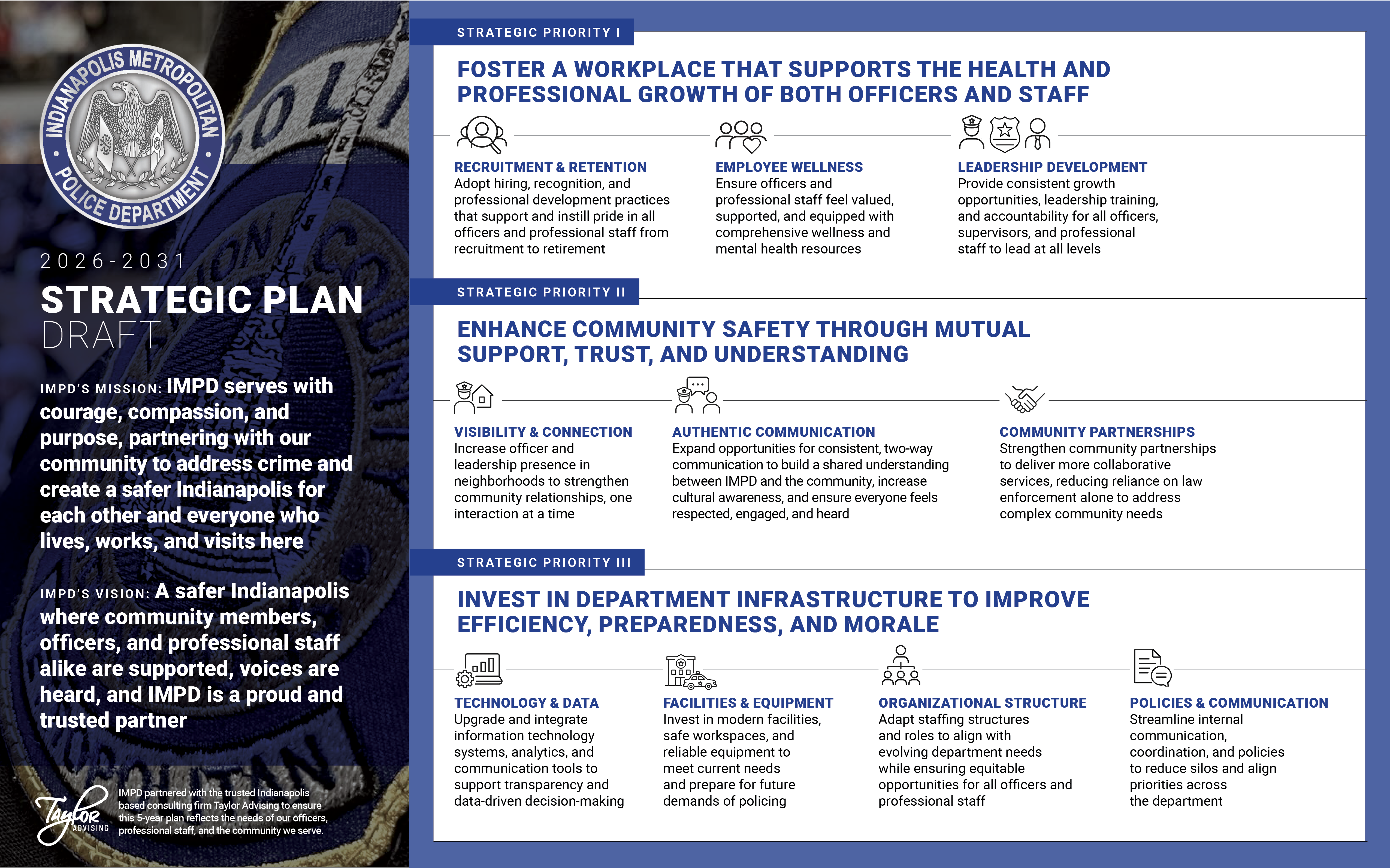 The Indianapolis Metropolitan Police Department’s 5-year strategic plan includes three focus areas: supporting officers and staff, building trust within the community and enhancing safety throughout the city.