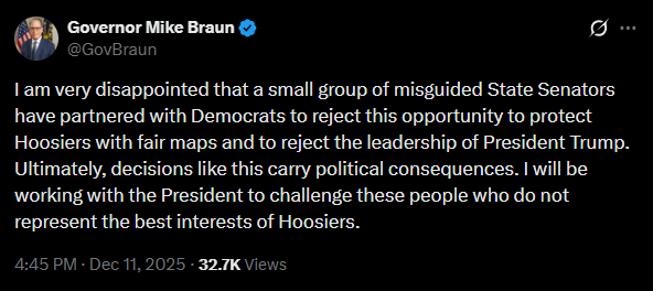 As the Senate debated the bill to redistrict, Vice President Vance tweeted that the Republican Senate President, Rodric Bray, had told the administration he wouldn't fight redistricting while whipping his members against it. "That level of dishonesty cannot be rewarded," Vance wrote.