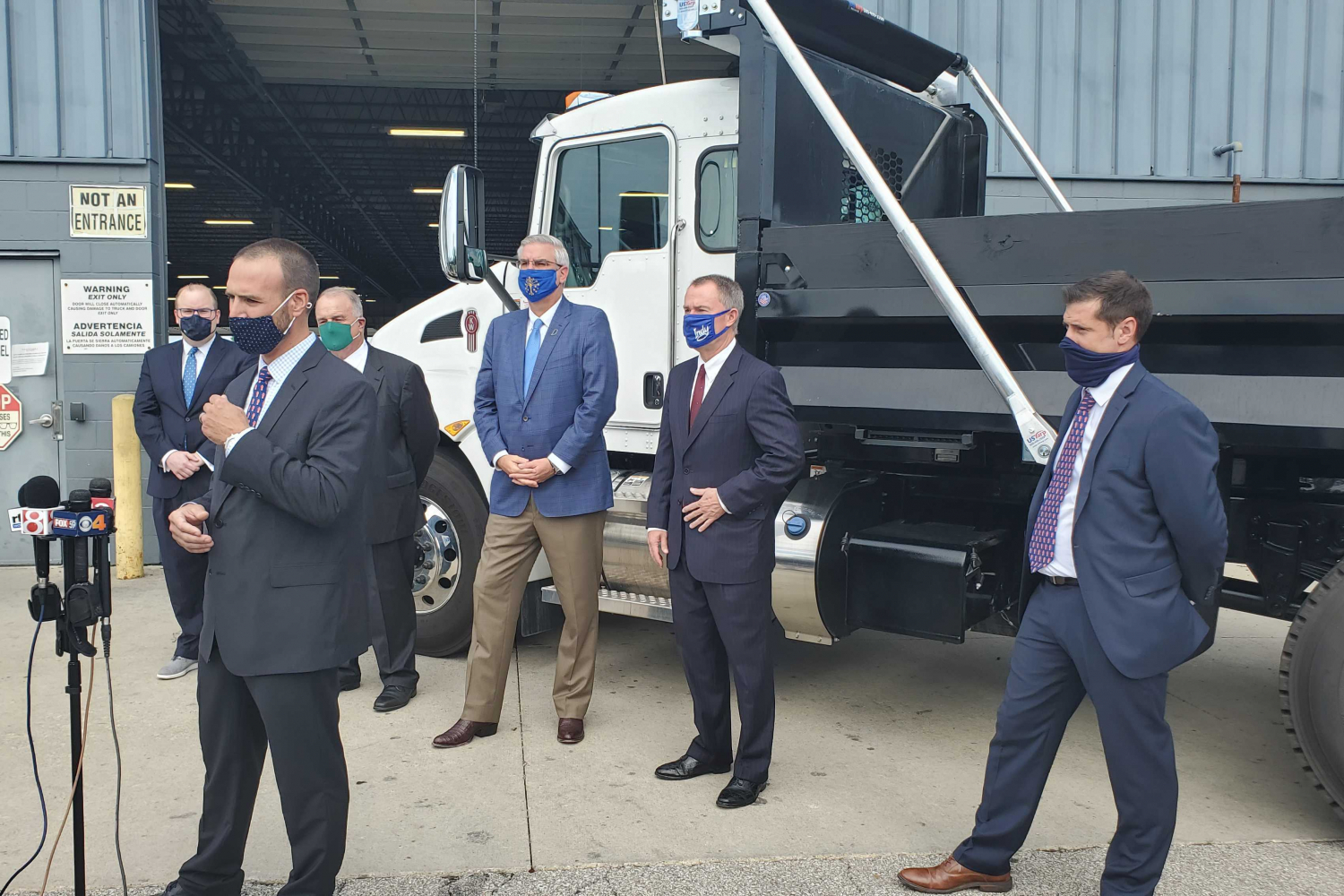 Palmer Trucks CEO John Nichols discusses the company's decision to expand during the coronavirus pandemic with Gov. Eric Holcomb, Indianapolis Mayor Joe Hogsett and other officials in attendance.