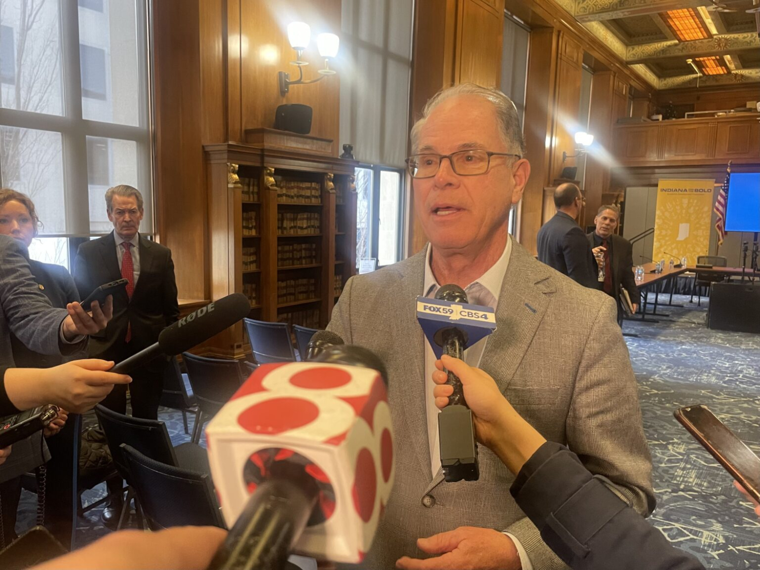 Gov. Mike Braun answers reporter questions after a meeting of the Indiana Economic Development Corp.’s board of directors on Wednesday, March 18, 2026 at the State Library in Indianapolis.