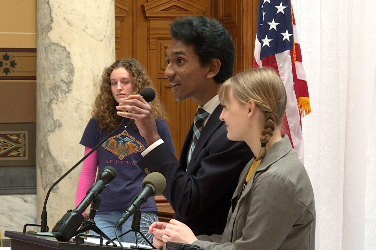 Co-leaders of the youth activist group Confront the Climate Crisis Rahul Durai (left) and Ashlyn Walker (right) at an event last year urging lawmakers to create a climate task force.