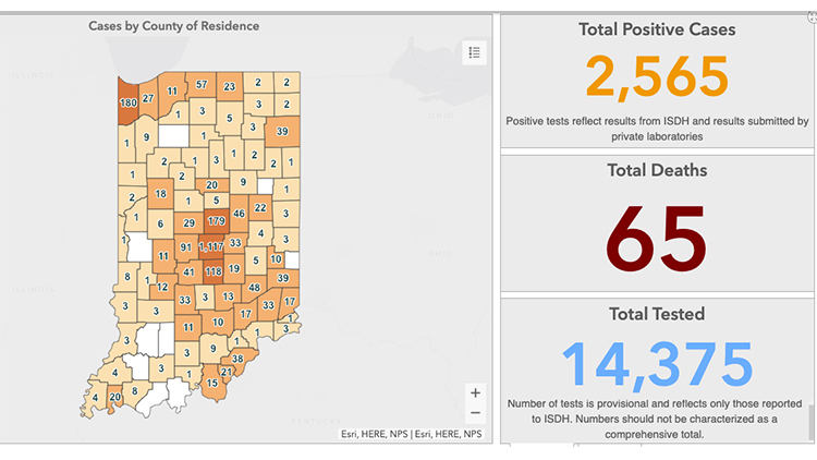 Indiana State Department of HealthINDIANAPOLIS (AP) — Sixteen more people have died in Indiana from coronavirus-related illnesses, raising the state’s virus death toll to 65 as its confirmed cases surged by more than 400, state health officials said Wednesday.