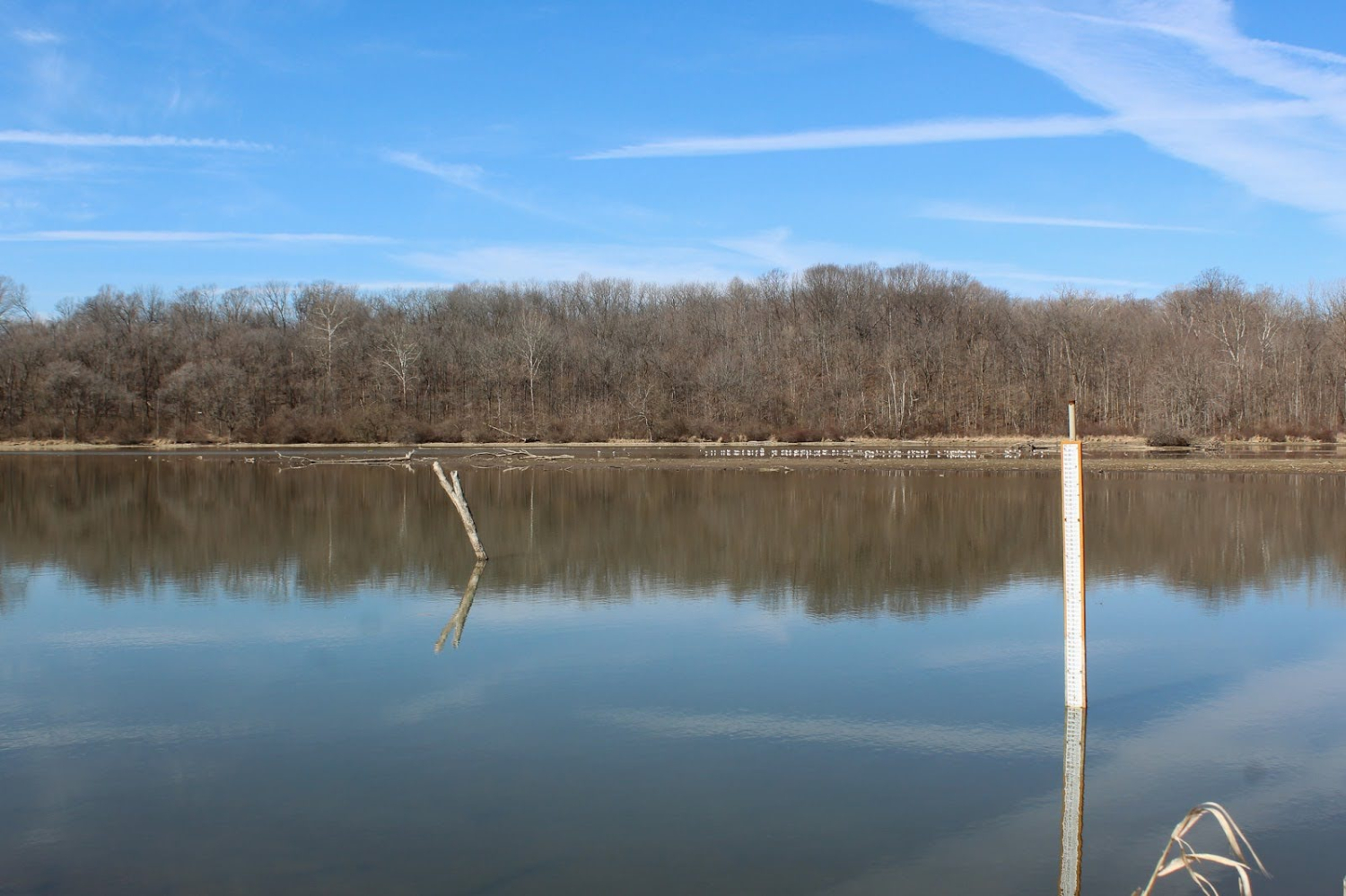 A water level gauge stands in the Eagle Creek Reservoir on Wednesday, March 18, 2026.