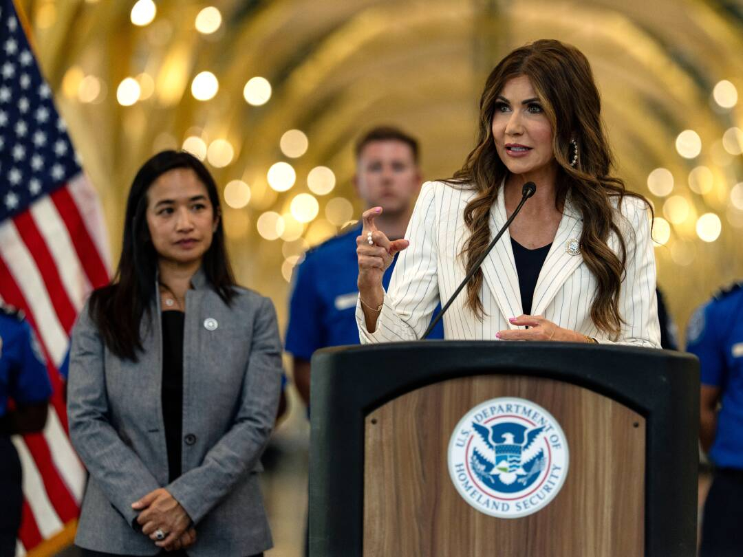 U.S. Secretary of Homeland Security Kristi Noem speaks at Ronald Reagan Washington National Airport on July 8 in Arlington, Va. Multiple airports are refusing to play a video where Noem blames Democrats for the government shutdown.