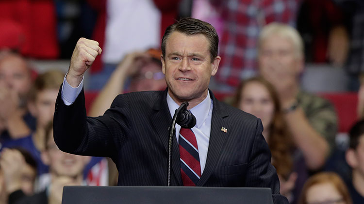 Sen. Todd Young, R-Ind., speaks at a campaign rally featuring President Donald Trump at the Allen County War Memorial Coliseum in Fort Wayne, Ind., Monday, Nov. 5, 2018.