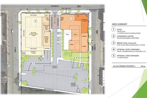 A bridge will connect the conference center to a six-story hotel. The hotel will have underground parking, a restaurant, indoor pool and bar.