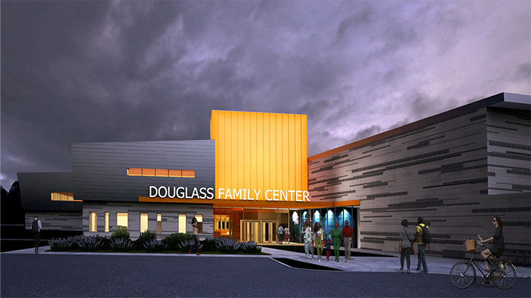 The brand new Frederick Douglass Park Family Center will include a gym, community rooms, stage, kitchen, studios, playground, and shelters.