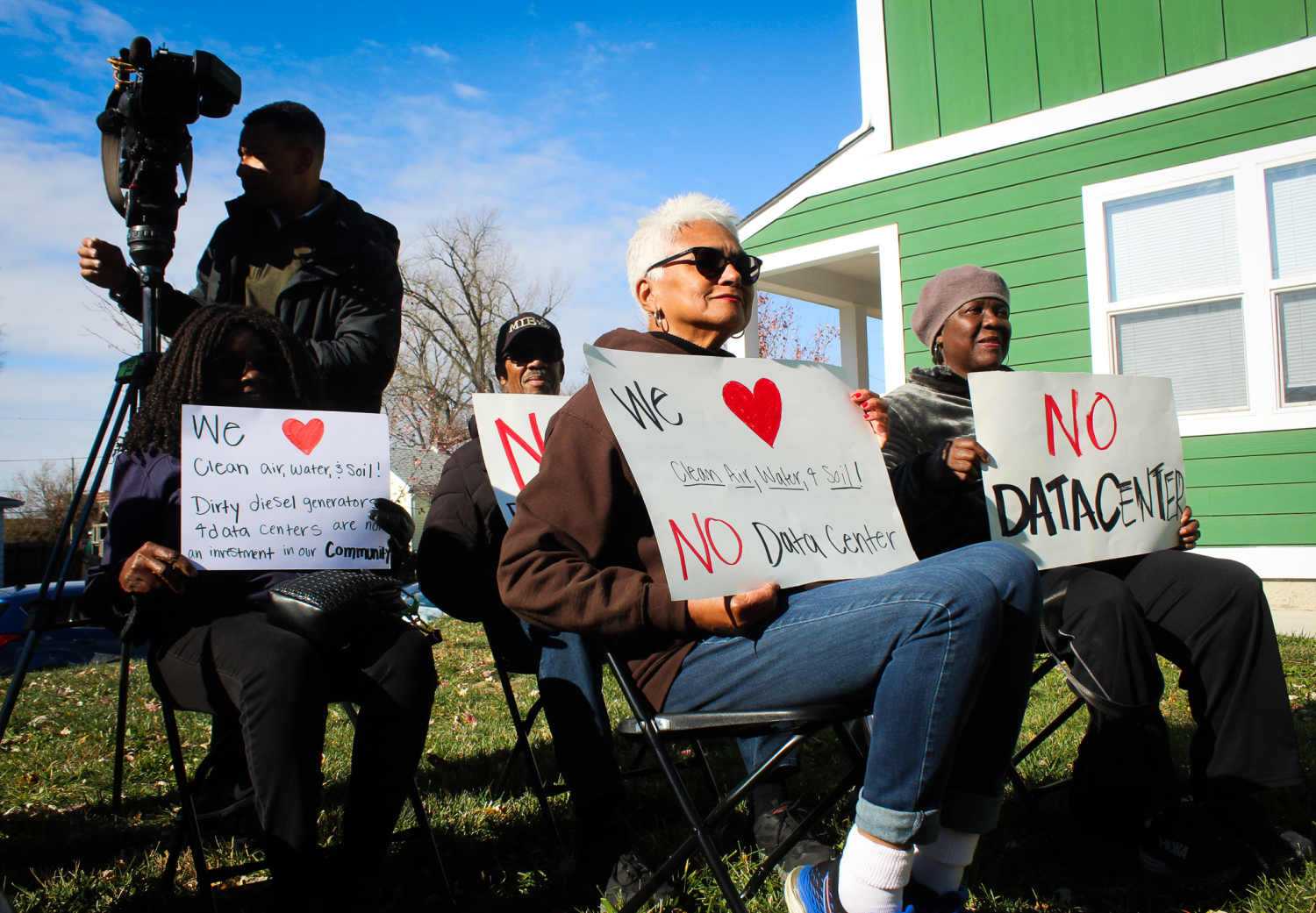 Residents display signs at a press conference in Indianapolis’ Martindale-Brightwood neighborhood on Monday, Nov. 17, 2025. Organizers said the proposed Metrobloks data center would threaten local environmental cleanup efforts and fail to serve the community’s needs.