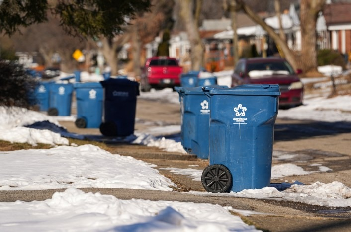 Trash receptacles line the sidewalk Jan. 24, 2025, in the Bellaire neighborhood of Indianapolis.