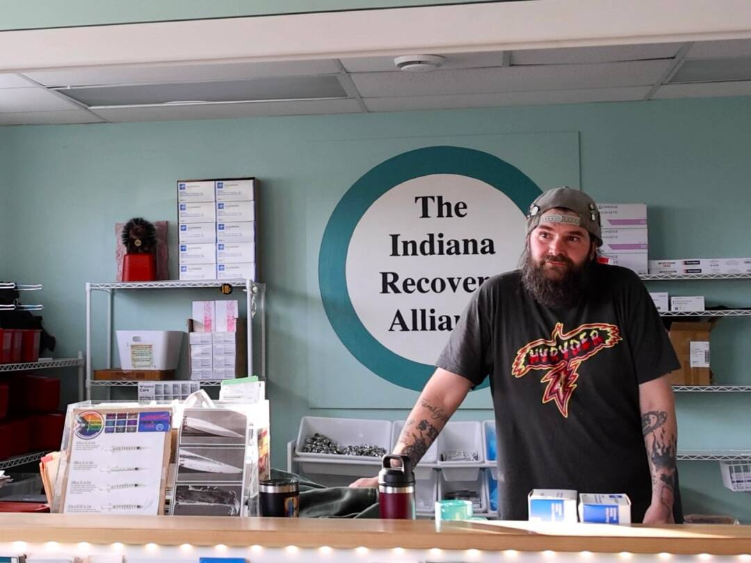 Scott Pietrovich stands behind the front desk of the Indiana Recovery Alliance on West Third Street in Bloomington. The nonprofit offers anonymous syringe exchanges and other services.