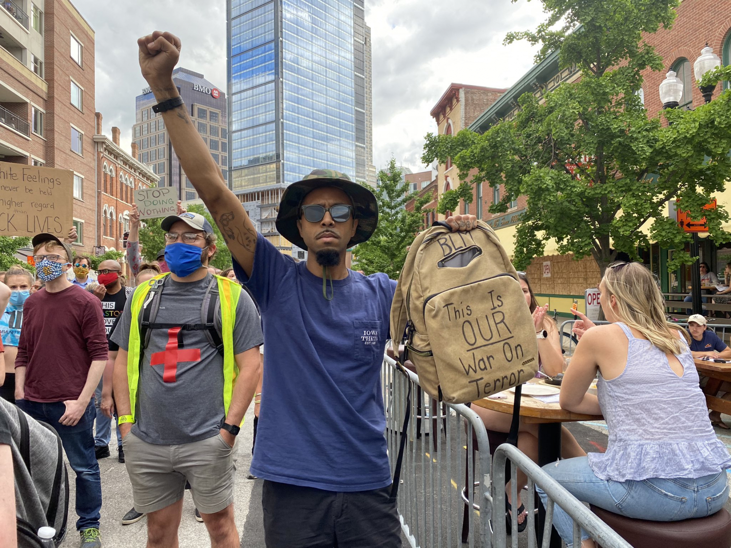 Along the way back to Monument Circle, protest organizers occasionally stopped the march and addressed those on the patios of nearby establishments. They shared the group's demands with diners. Organizer Zion Smith urged white resturant patrons to support the protests and gave examples of how to get involved.