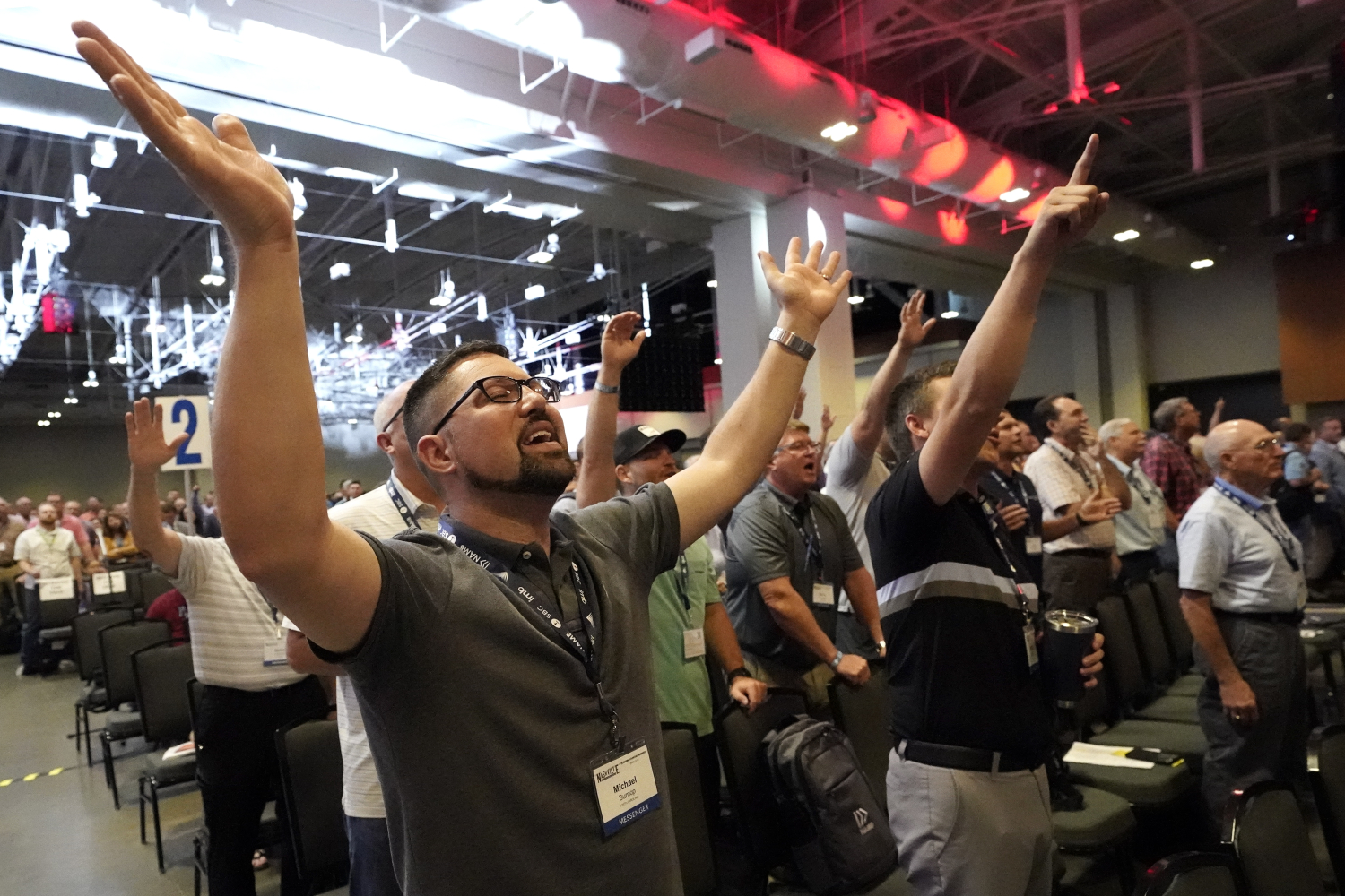 People take part in a worship service during the annual Southern Baptist Convention meeting Tuesday, June 15, 2021, in Nashville, Tenn. Southern Baptists gathering at their next annual meeting June 11-12, 2024, in Indianapolis will vote on whether to enact a constitutional ban on churches with women pastors.