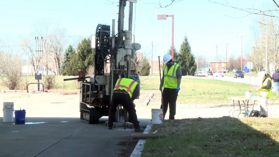 Workers for the consulting firm Creek Run Environmental drill through the concrete at an old gas station site in Columbus to collect soil samples. (Tyler Lake/WTIU)