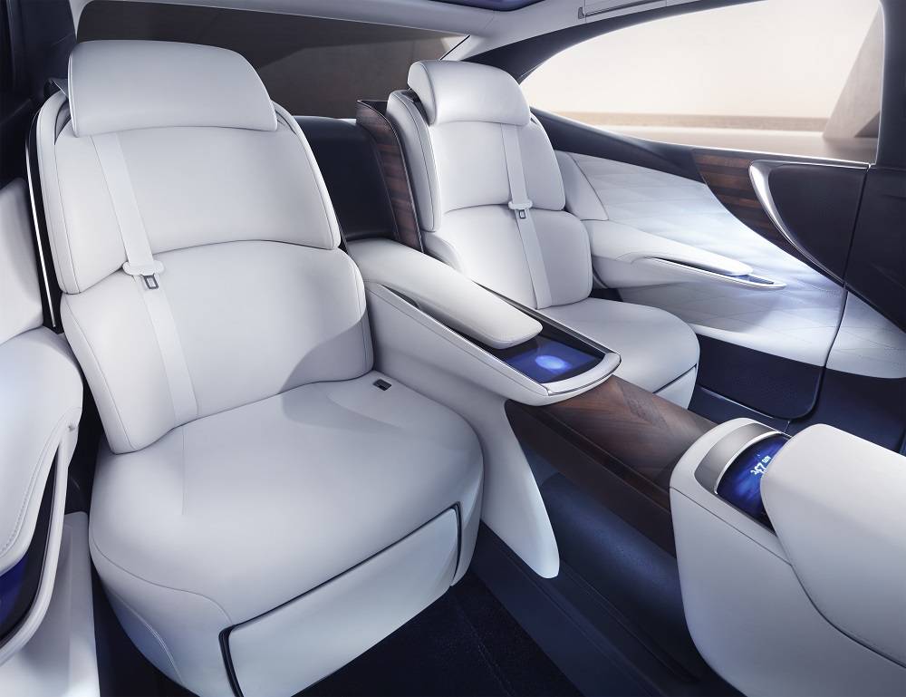 At least in profile, you're looking at the next LS flagship sedan. L-finesse styling, mesh spindle grille, and L-shaped running lamps accent a four-door coupe profile over 21-inch wheels with carbon fiber-reinforced plastic rims. Front seats seem to float while two rear passengers are spoiled in cocoons of wood and leather. Infotainment is controlled with in-air hand gestures. Fuel cell power and traffic prediction systems elevate the luxury standard-bearer.