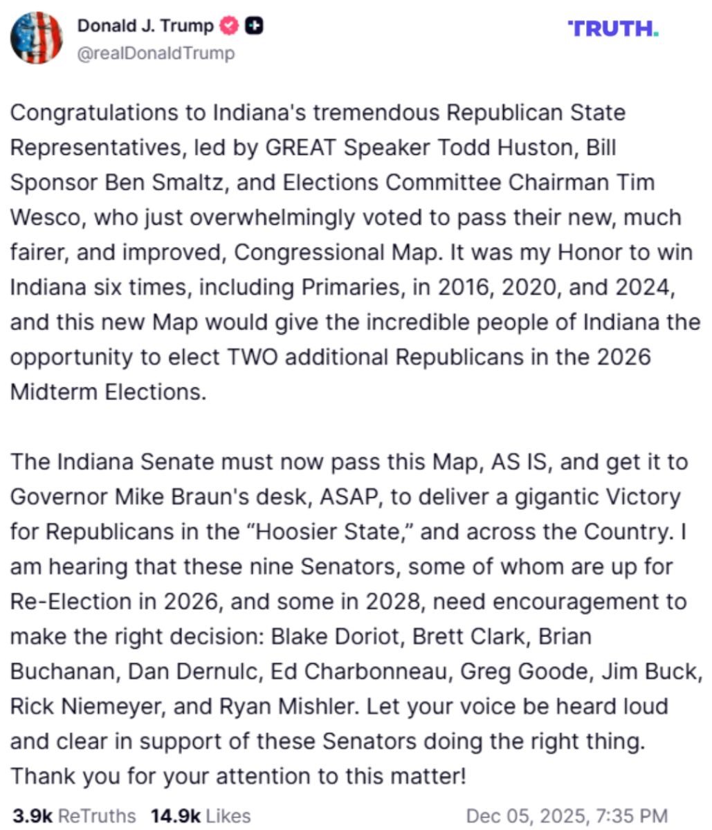 In his post, Trump congratulated the “GREAT” House Speaker Todd Huston (R-Fishers) and bill sponsor Ben Smaltz (R-Auburn) for passing their “new, much fairer, and improved, Congressional Map.”