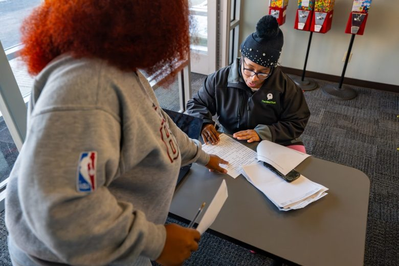 Lauresha Island, a resident of Carriage House West Apartments, completes paperwork as people meet with court navigators ahead of their proceedings at the Wayne Township Small Claims Court in Indianapolis on Dec. 4, 2025. The navigators work as part of the city’s Tenant Advocacy Project, which provides free legal representation to residents facing eviction. The navigator team — non-attorneys who serve as the first point of contact for people in court — is scheduled to be dissolv