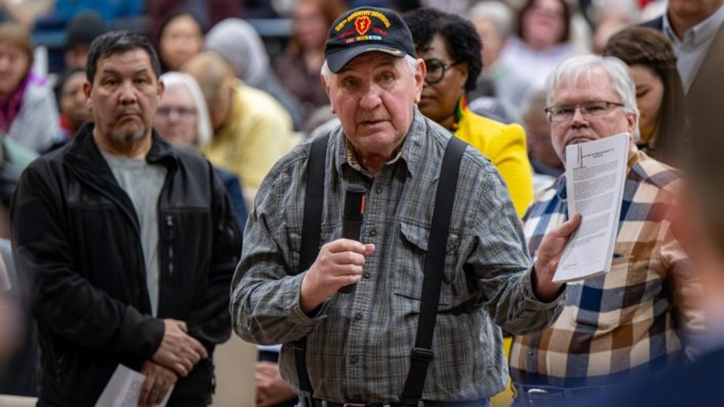 Tom Rzepka addresses representatives of the various entities involved in the development of the LEAP project. Community members gathered, February 10, 2026, at New Augusta Public Academy, to discuss their concerns about the impact Lebanon’s LEAP project will have on water leaving and returning to the Eagle Creek Reservoir.