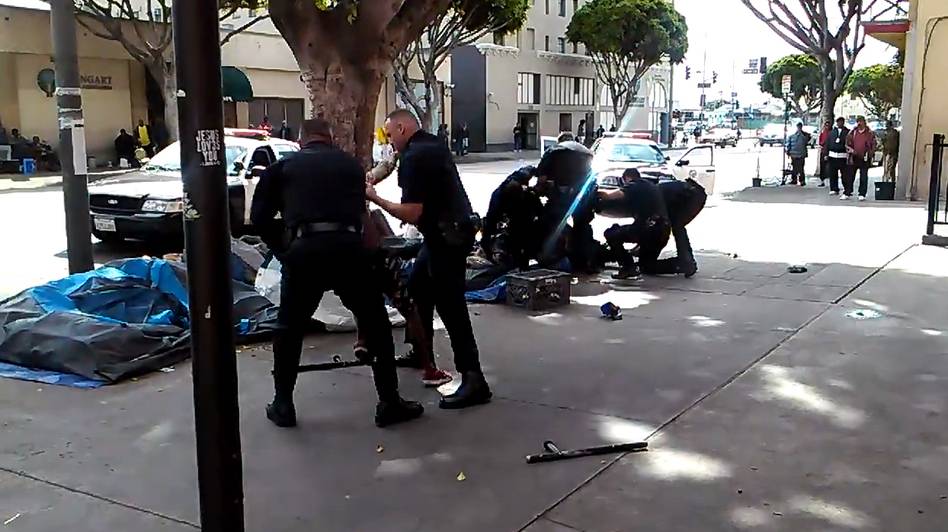 - After officers responded to reports of a robbery around noon Sunday, "the suspect began fighting and physically resisting the officers' attempts to take him into custody," the Los Angeles Police Department says.