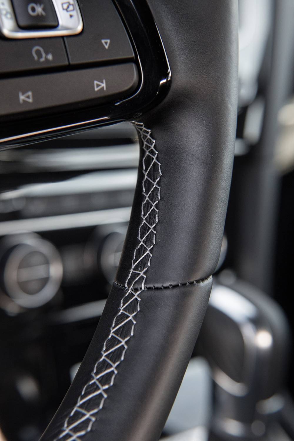 When we walked a little closer, it was clear something a little more sinister than a sweet little Golf was percolating. Sure, the neatly creased hood, swept windshield, straight roofline, and upright backlight are shared with other Golfs, but the R receives a more aggressive front facia, accentuated side skirts, rear diffuser, dual chrome exhaust tips, and 18-inch alloys. Bi-Xenon headlamps and LED driving lights brighten its face. “R” logos are everywhere; check the black brake calipers, grille, and faux vents on the fenders.