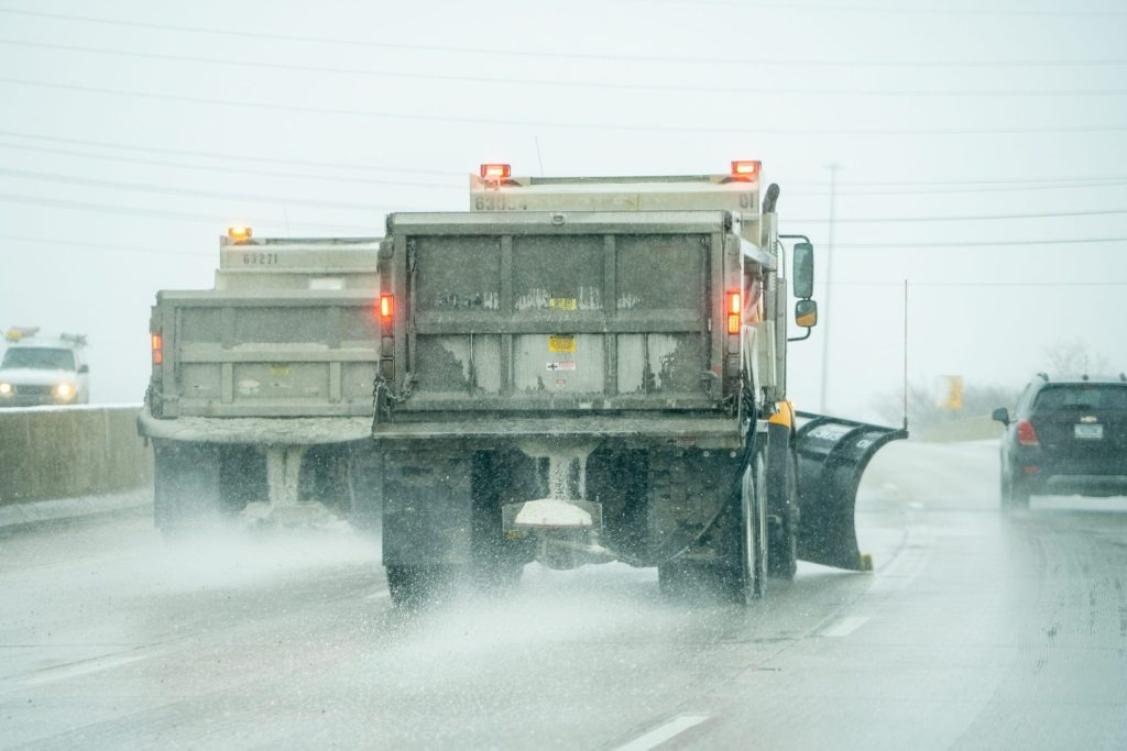 A snowplow truck salts I-70 eastbound Nov. 10, 2025, in Indianapolis.