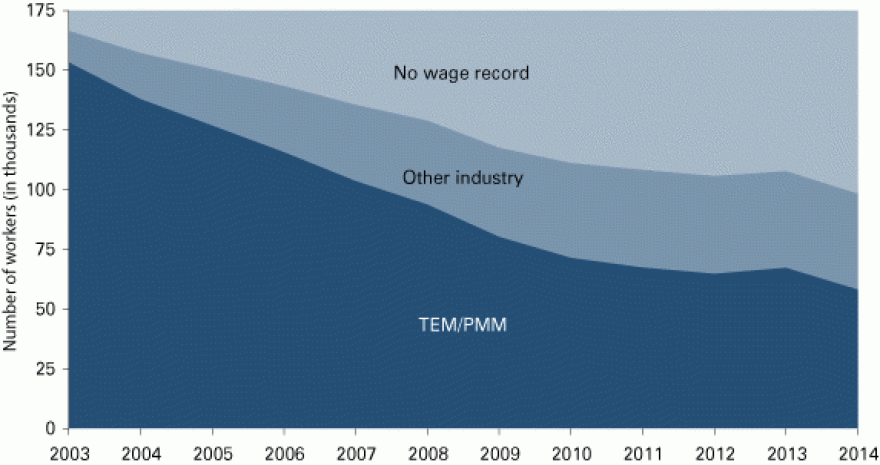 His study looked at about 175,000 workers in the state's top two manufacturing sectors — primary metals and transportation equipment — starting in 2003. By 2014, he says, only a third of the workers were still employed in those fields.
