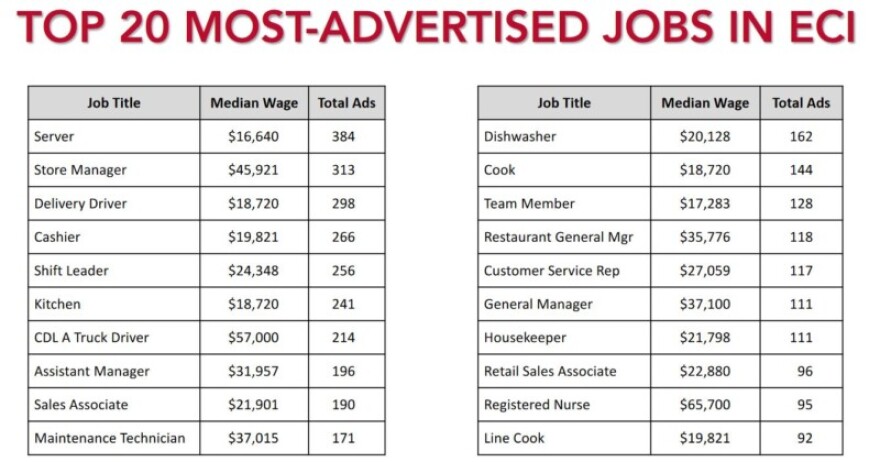 As for jobs, he says the top 20 jobs advertised for in the region are largely retail and service positions that pay lower wages. The top three? Servers, store managers, and delivery drivers.