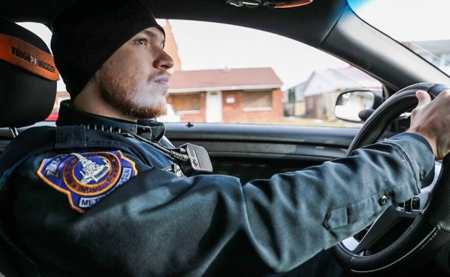 IMPD officer Jeremy Torres patrols the Towne and Terrace housing complex off of 42nd Street and Post Road, on Saturday, Dec. 8, 2018. (Jenna Watson/The Indianapolis Star)