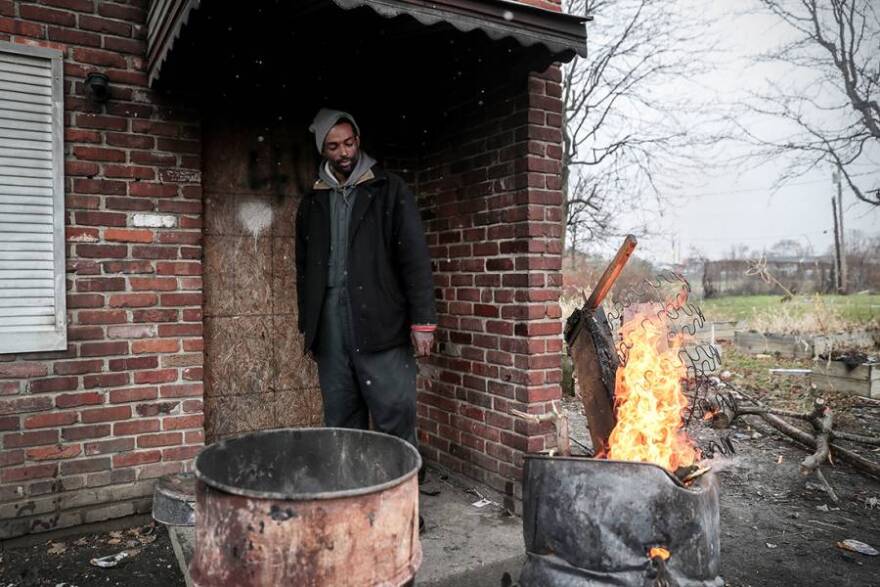 Two men near the barrel talked to reporters on a recent cold and snowy afternoon. They were evasive when explaining why they were there. One man, who identified himself as Pac-Man, said he is homeless, but sleeps outside the boarded-up units. He gestured toward what appeared to be a garden and said he plans to spruce it up in the summer.